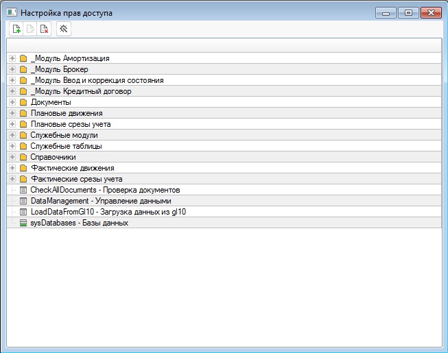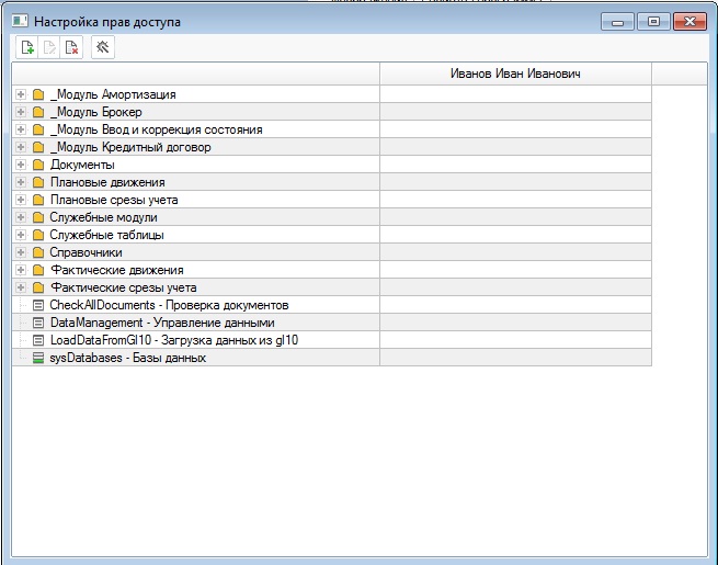 Рассмотрим пример настройки прав доступа пользователя Иванов к модулю Амортизация. Откроем пункт меню Файл->Настройка прав доступа. И увидим форму настройки следующего вида
