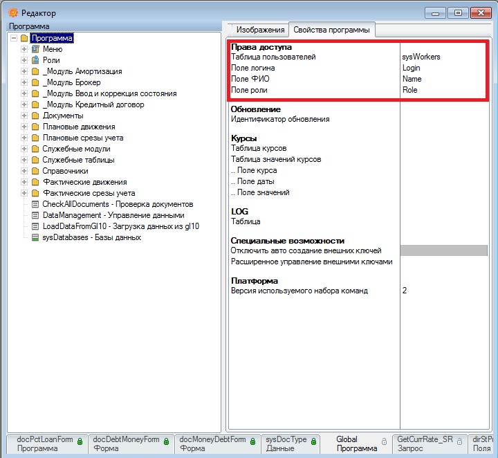 Внимание: Перед настройкой прав доступа, надо проверить процедуру OnCreate модуля Global, которая запускается автоматически при запуске программы, и учесть используемые в ней объекты метаданных, которые надо разрешить пользователю для запуска программы. Например, в нашем случае в процедуре OnCreate модуля Global идет проверка на актуальность загруженных курсов валют, следовательно, надо дать право пользователю на таблицу курсов валют, чтобы он смог зайти в программу. Также для запуска программы пользователю необходимы права на чтение таблицы пользователей (в нашем случае вышеуказанная таблица sysWorkers)