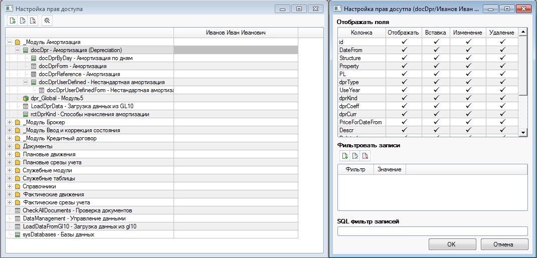 Рис.7 Пример настройки фильтров для разграничения прав на уровне записей