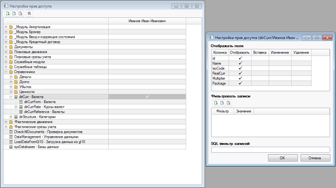 Автоматически разрешены для пользователя 1 (Иванов) поля rctCurr. Id, rctCurr. Name
