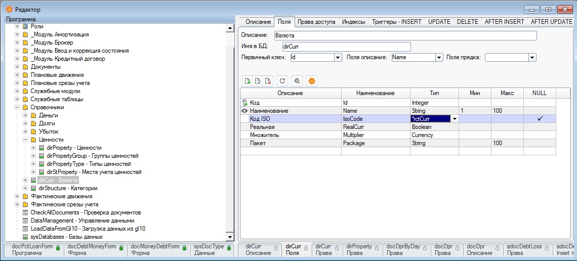 Как видно из рисунка 5, пользователю Иванов даны права на чтение всех полей таблицы dirCurr. Однако при отображении данной таблицы элементами интерфейса платформы, поле IsoCode, являющееся lookup-полем, заменяется значение поля Name из таблицы rctCurr (классификатор валют), что видно в редакторе (тип поля IsoCode — *rctCurr):